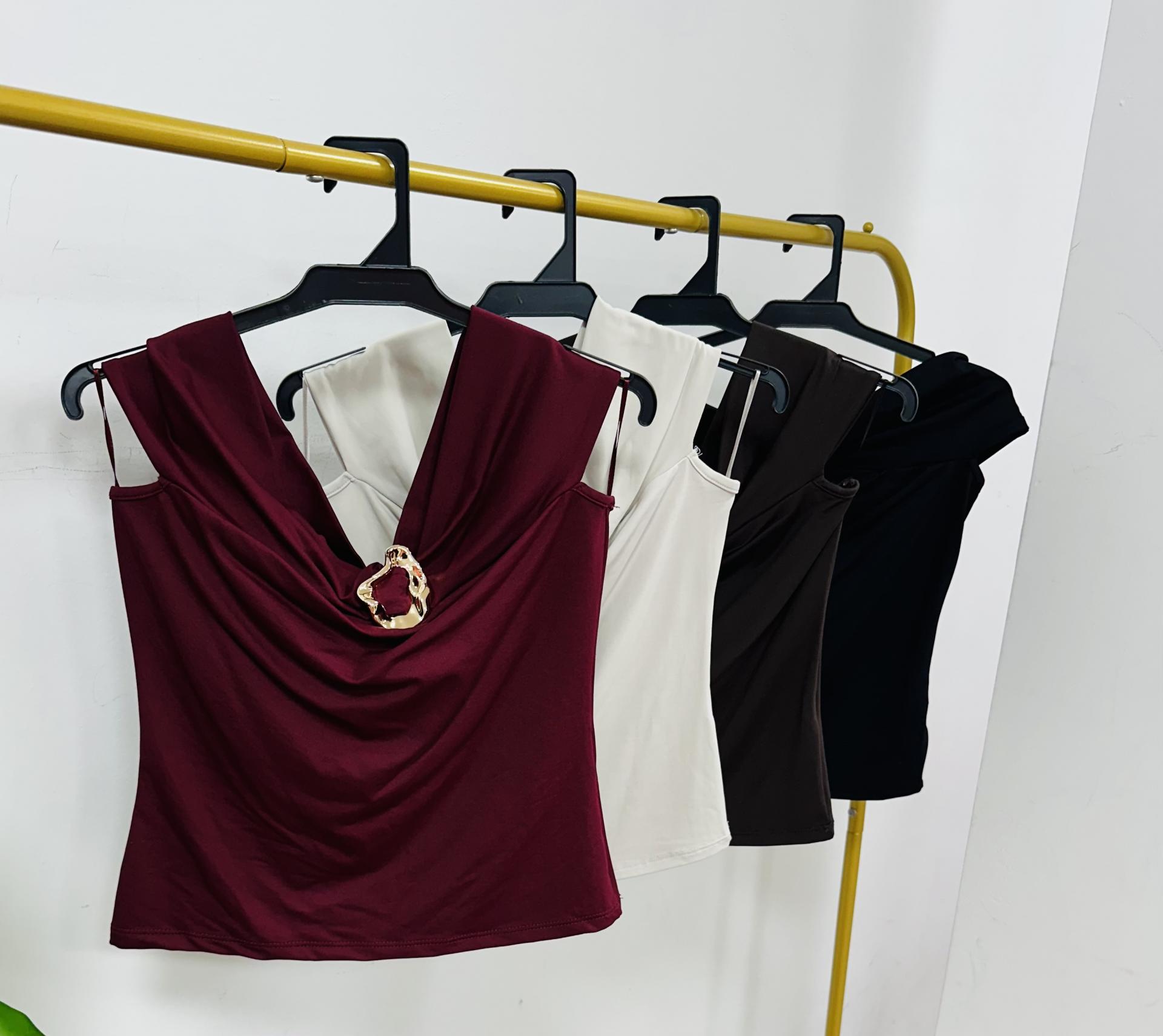 Es un top de licra con escote de barco y chapa de adorno en el centro del pecho .