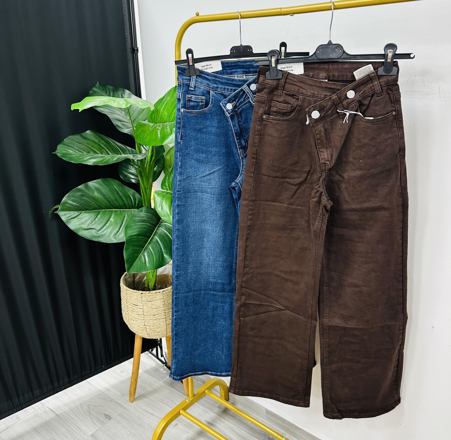 Pantalón elástico de pata ancha tiro alto y botines cruzados .