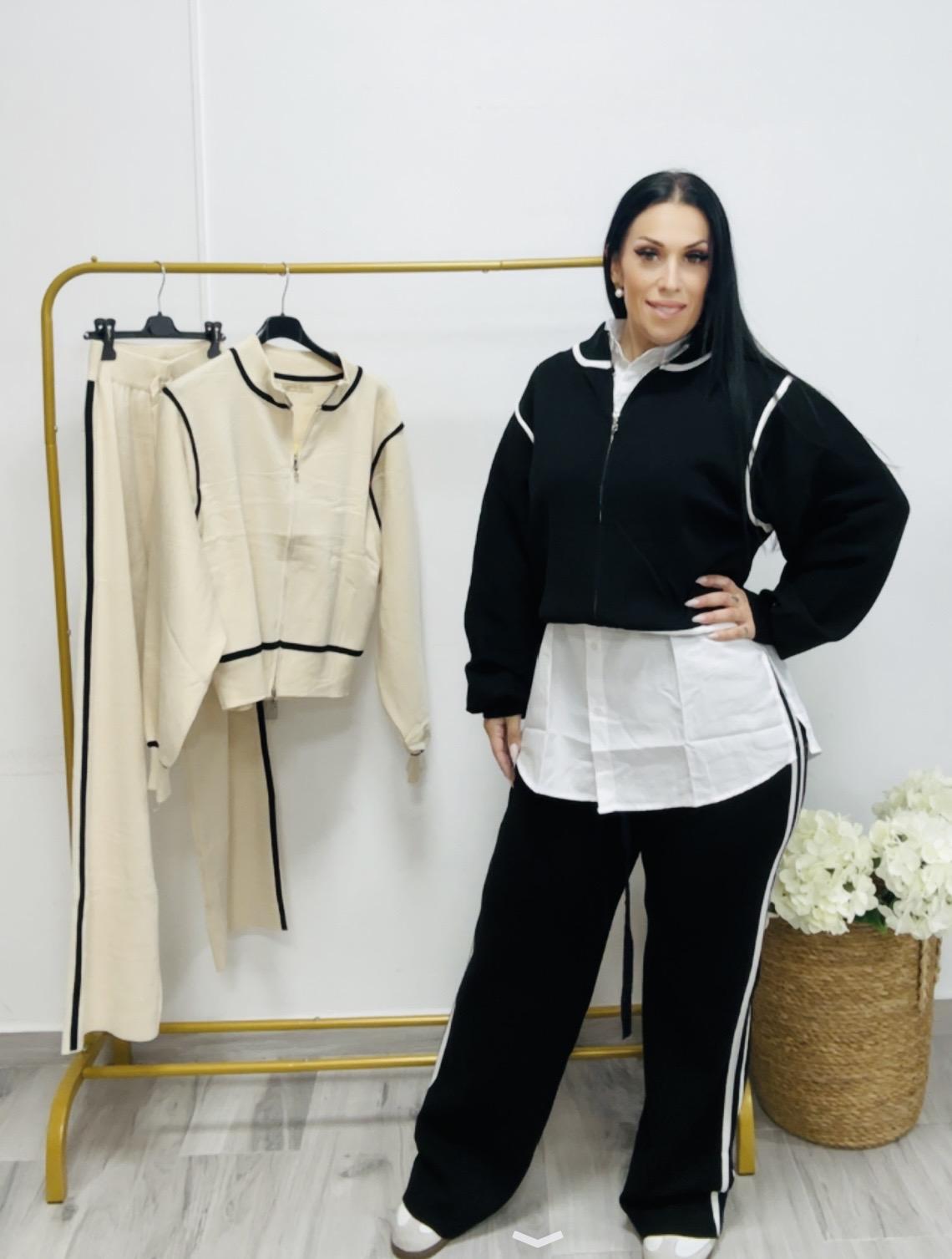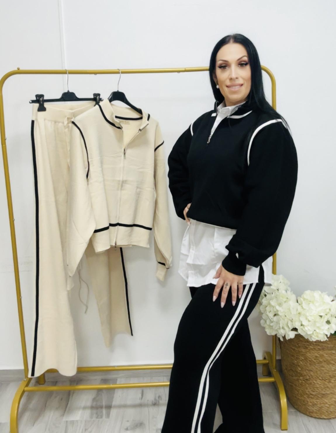 Compuesto por una chaqueta y un pantalón con goma en la cintura y pata recta .Contine una raya de adorno que le da un toque más informal y deportivo para la moda urban que se está instalando este año .