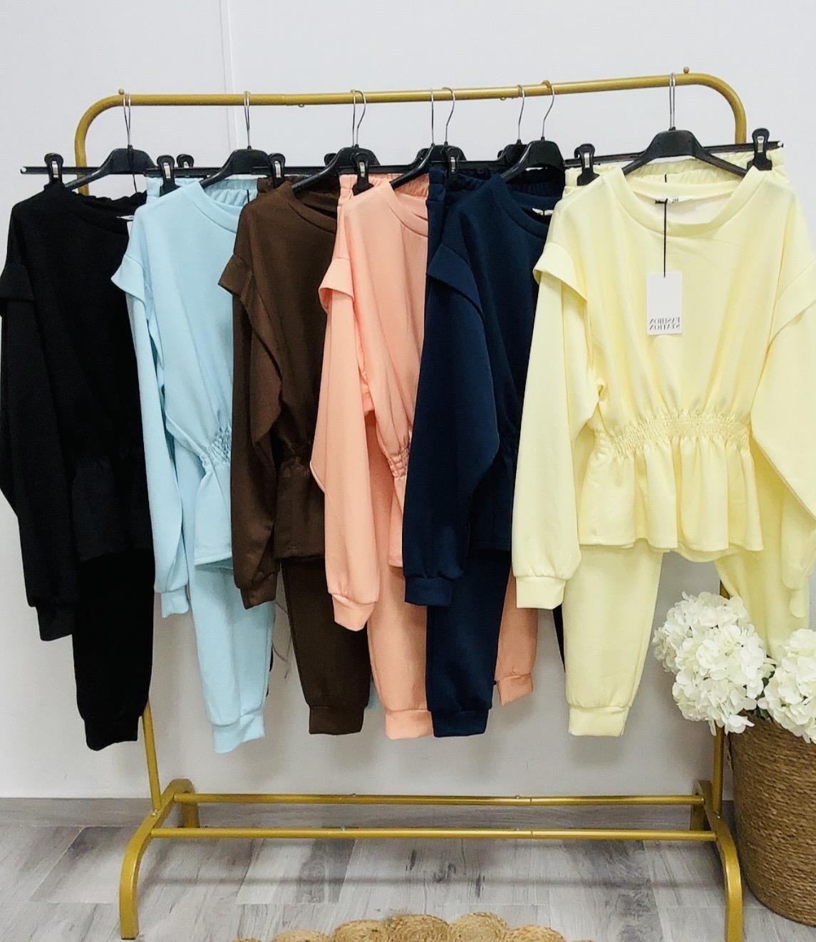 Compuesto por pantalón con puño abajo,goma en la cintura y bolsillos .Camiseta con una goma en la cintura y un volante en la parte baja que nos ayuda a disimular la parte de la barriga ,también contiene un dobladillo en la sisa dándole otro toque diferente .