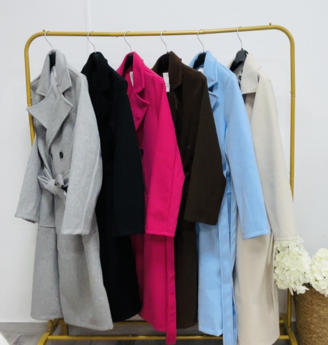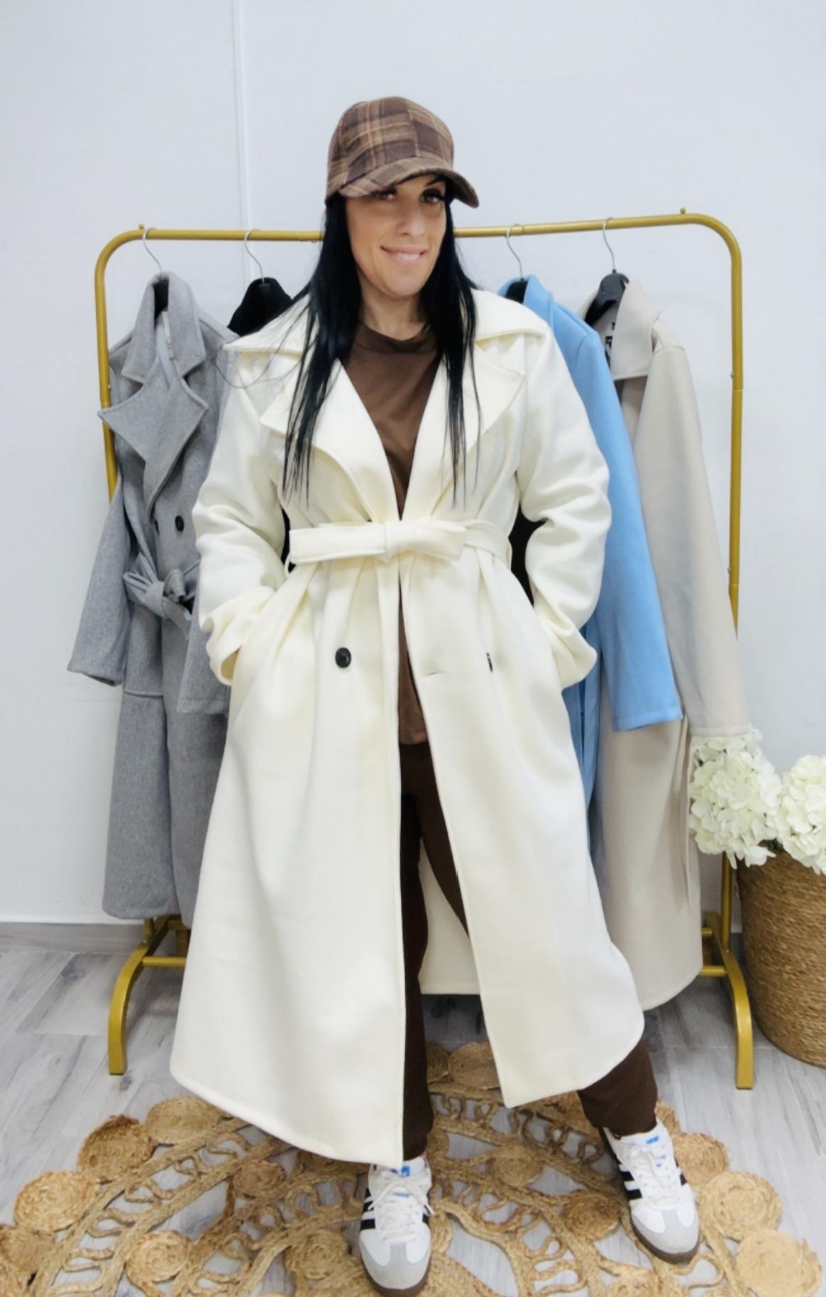 Chaqueta larga de paño con botones ,cinturones y bolsillos .