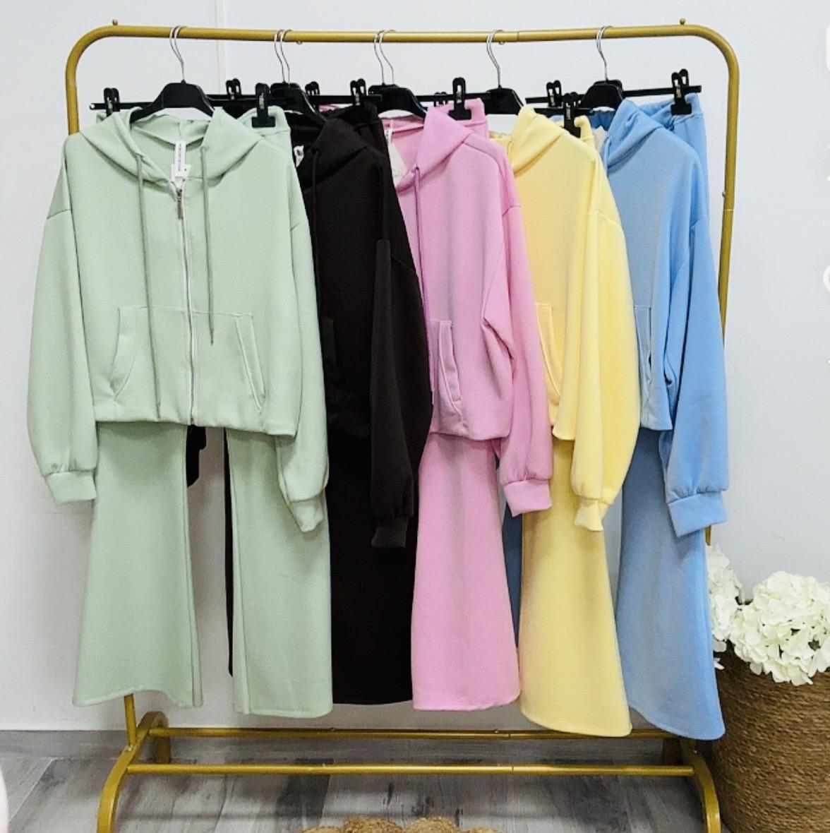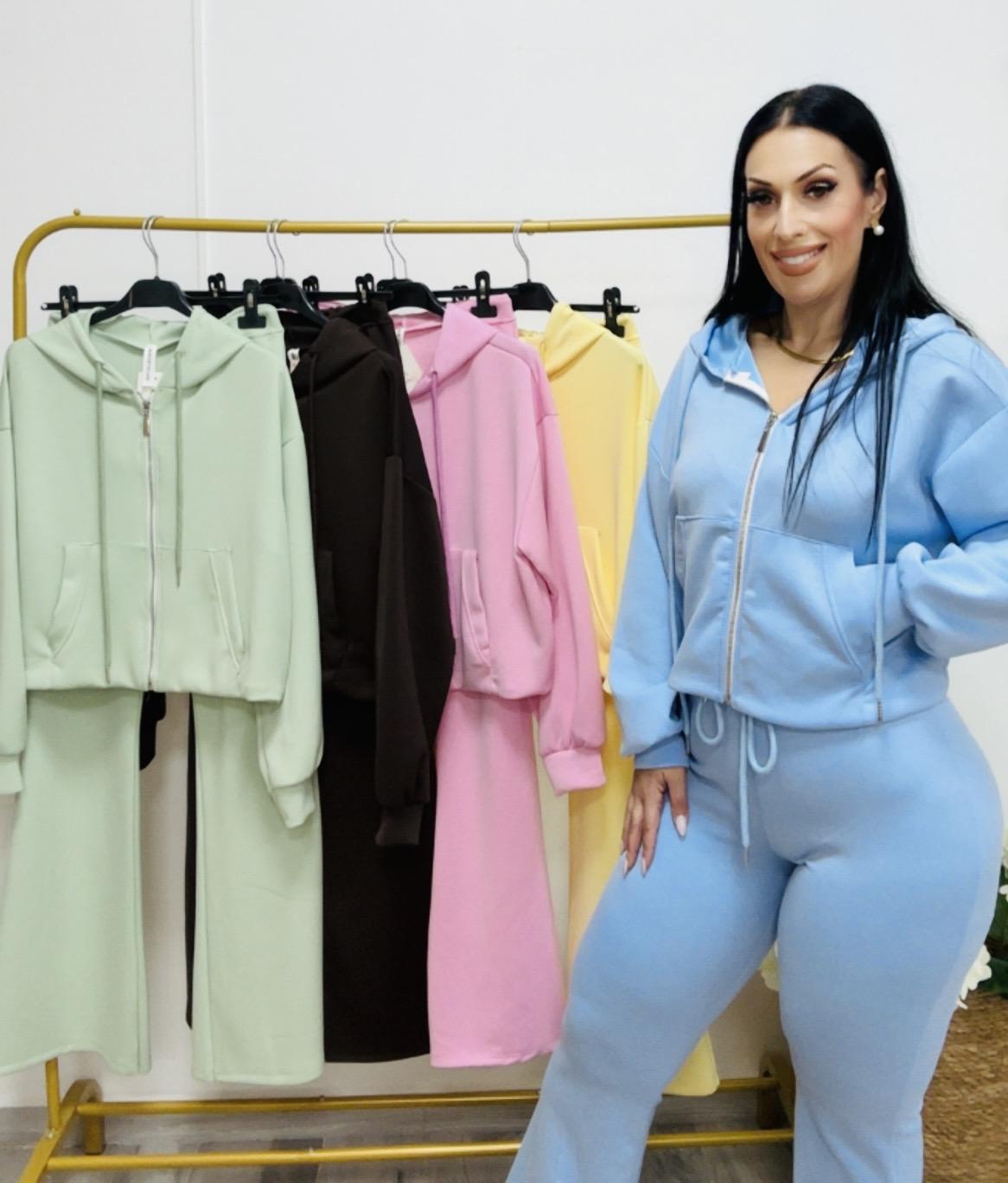 Conjunto de chaqueta deportiva con cremallera,capucha y bolsillos .La sudadera lleva coma en ka parte de la cintura por detrás para q entalle