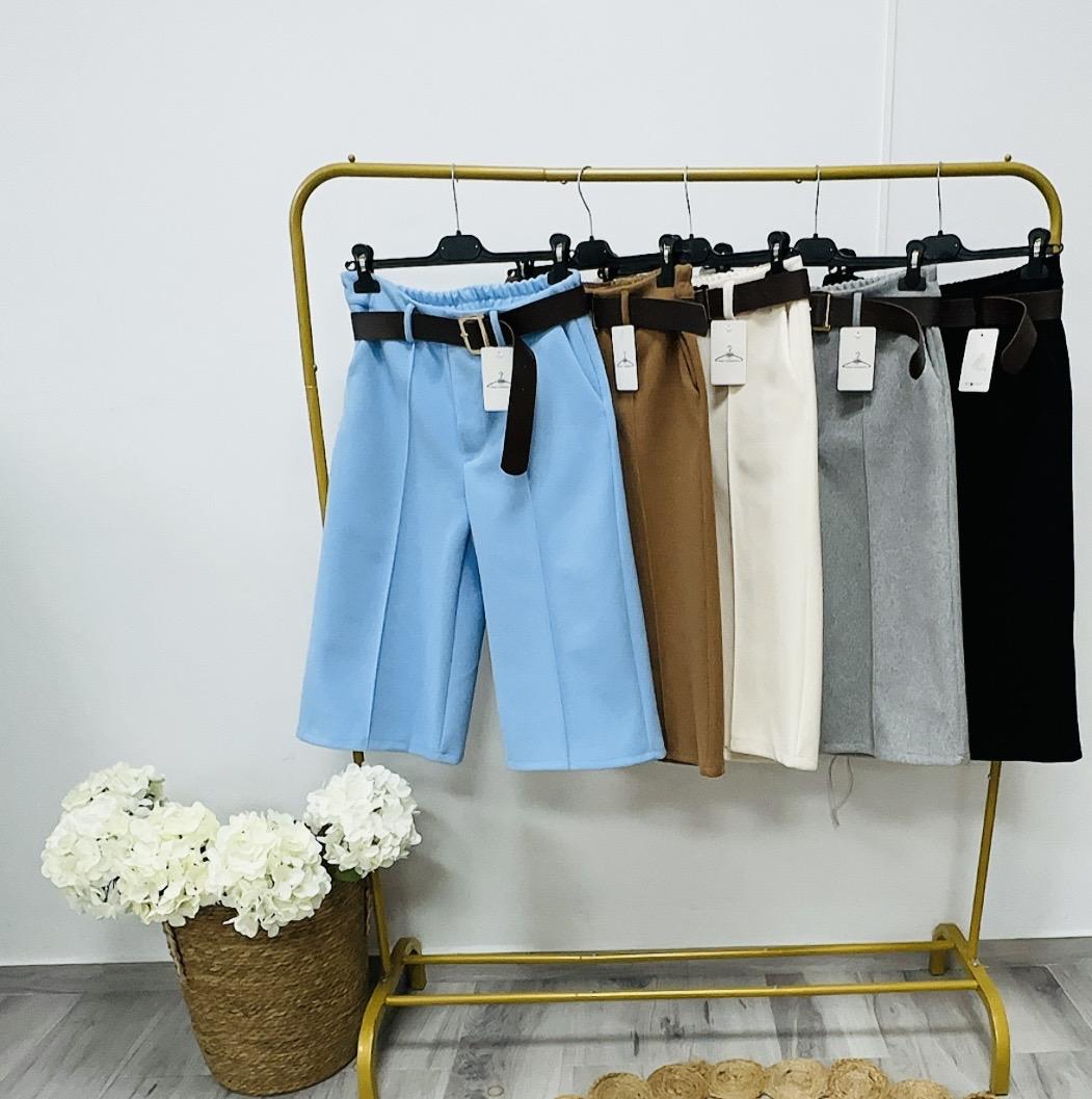 Pantalón de paño con cinturón y bolsillos de medida a media pierna .