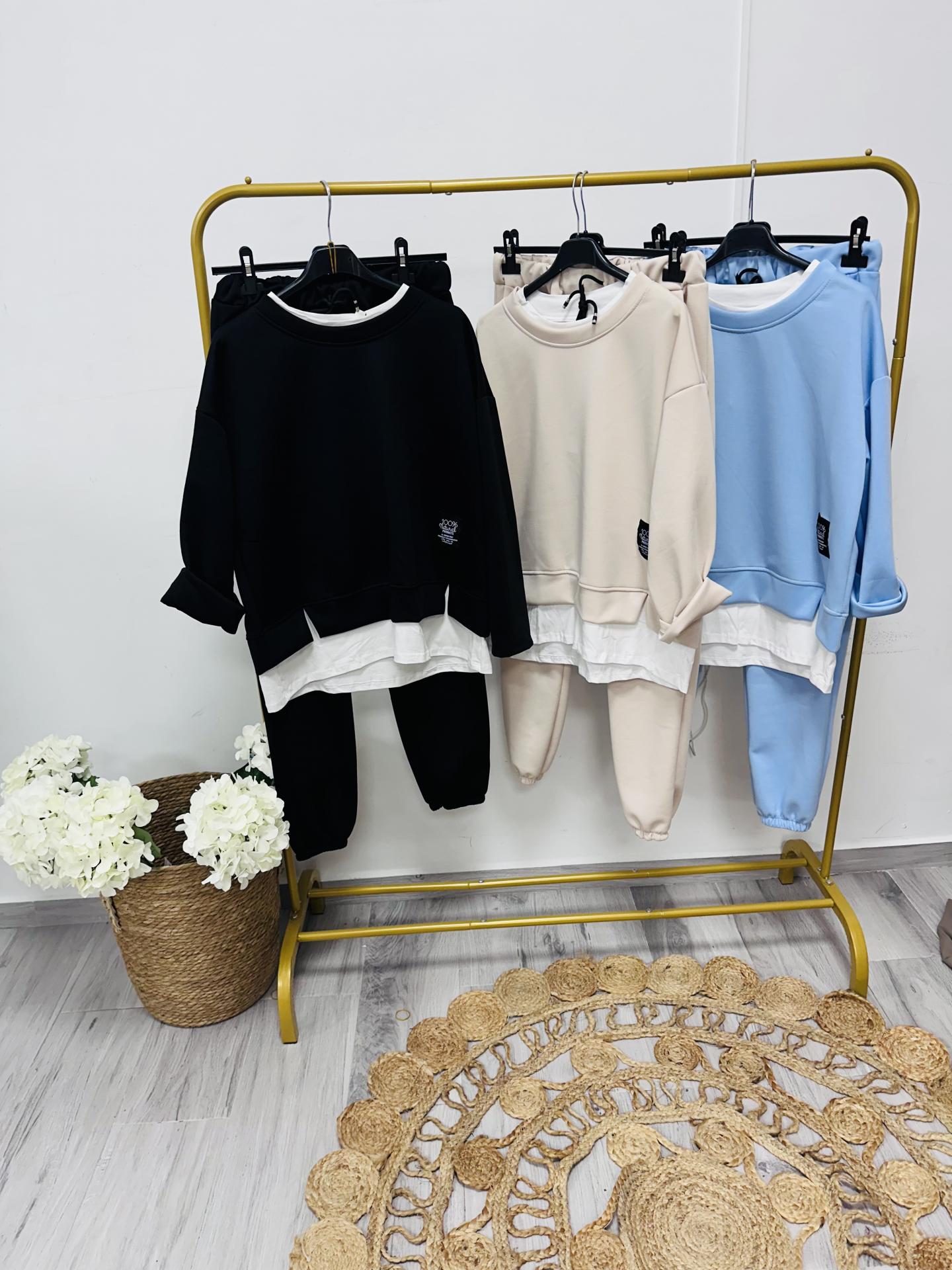 Conjunto de dos piezas compuesto por pantalón de goma en la cintura y puño en el tobillo y bolsillos ,sudadera con faldón y doble cuello