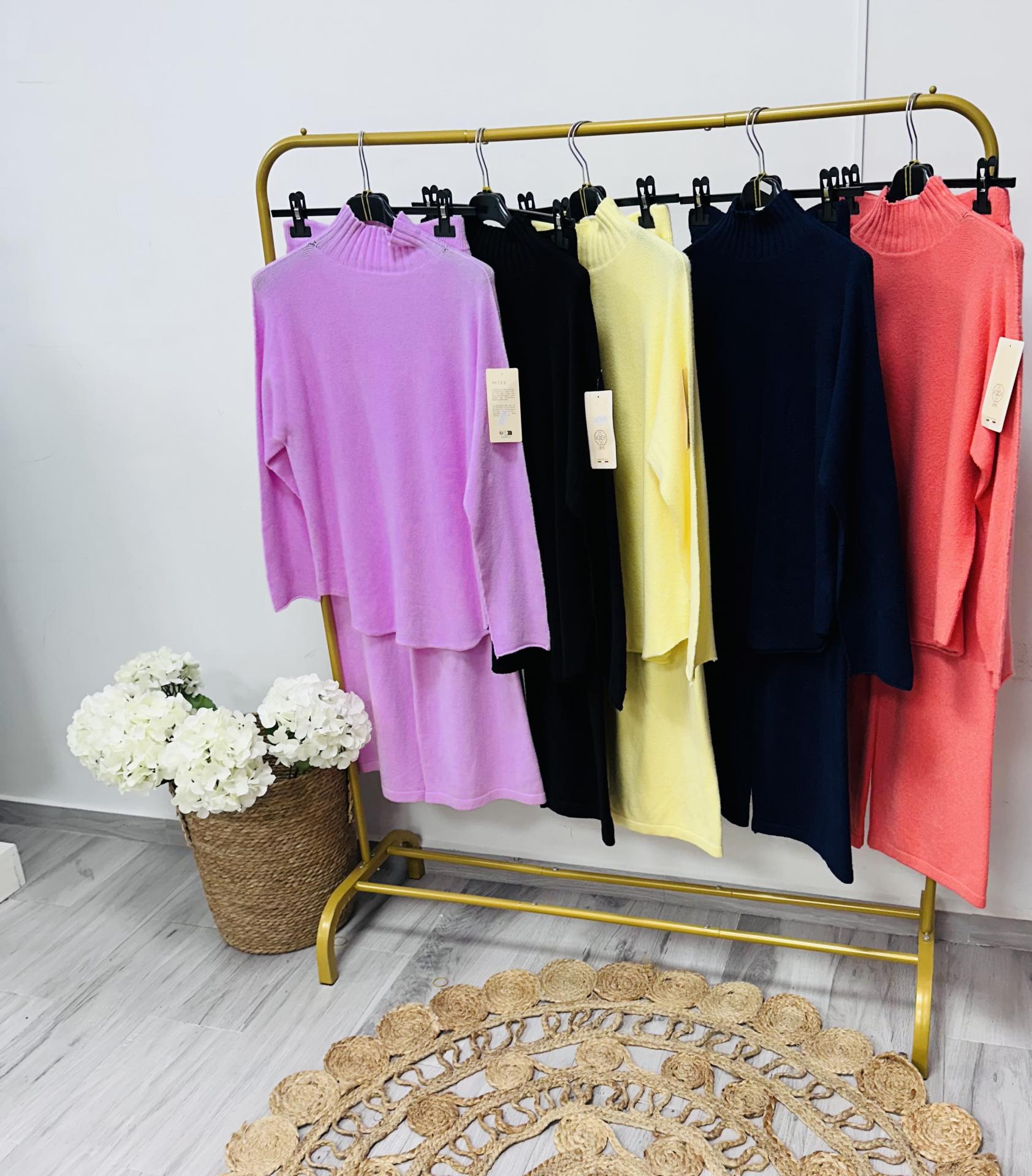 Conjunto punto súper suave compuesto por jersey de cuello cisne y pantalón de pata recta y goma en la cintura